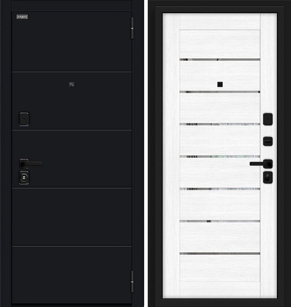 Надежная входная Дверь Браво Прайд Total Black/Snow Melinga премиум класса по цене 39 813 руб. Большая толщина стали защитит от проникновения в ваш дом, квартиру или коттедж. Используется очень качественная фурнитура: замки, цилиндры, ручки, защелки. Покрытие и отделка двери изготовлено под внимательным контролем производителя. Дверь имеет долгий срок службы и гарантию.