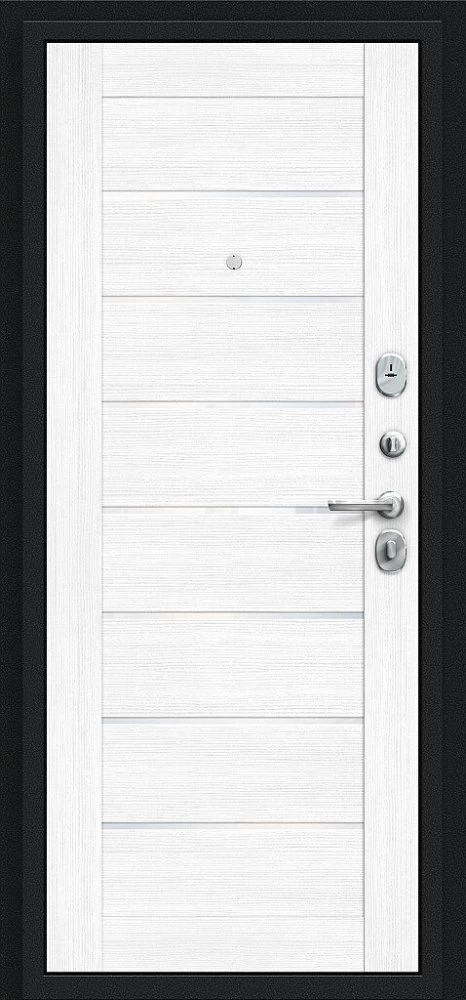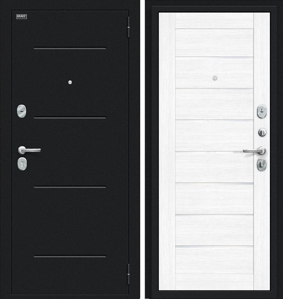 Надежная входная Дверь Браво Техно Букле черное/Snow Melinga премиум класса по цене 31 313 руб. Большая толщина стали защитит от проникновения в ваш дом, квартиру или коттедж. Используется очень качественная фурнитура: замки, цилиндры, ручки, защелки. Покрытие и отделка двери изготовлено под внимательным контролем производителя. Дверь имеет долгий срок службы и гарантию.